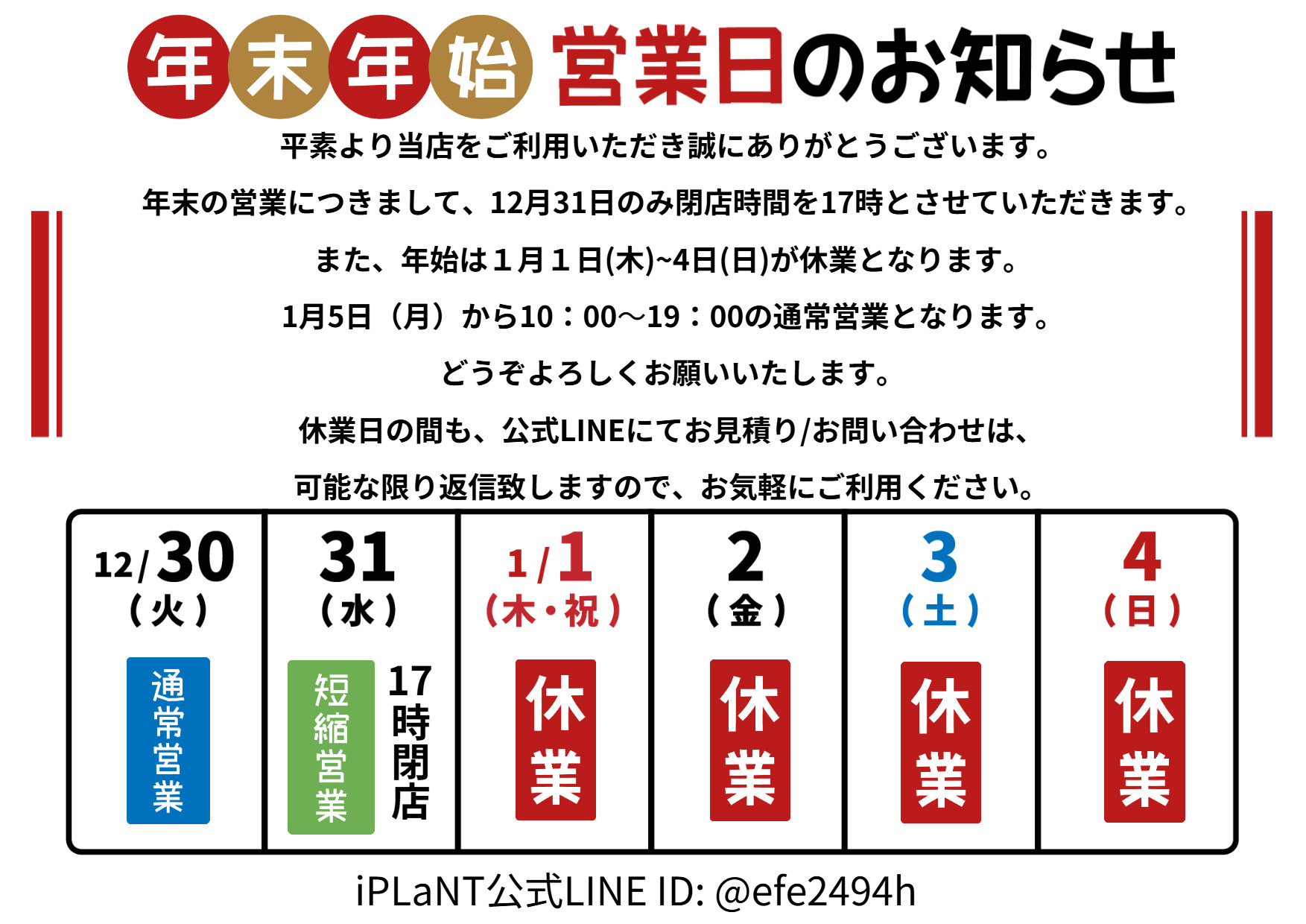 本年は格別のご愛顧を賜り厚く御礼申し上げます。 2025年12月31日(水)は17時閉店の短縮営業となり、2026年1月1日(木)より2026年1月4日(日)まで年末年始休業とさせて頂きます。