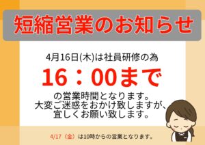 いつもiPhone/iPad即日修理店iPLaNT(アイプラント)のご利用ありがとうございます。 誠に申し訳ないのですが、4月16日木曜日は社員研修の為、10時から16時までの営業時間とさせて頂きます。 大変ご迷惑をおかけいたしますが、宜しくお願い致します。 定休日:毎週日曜日